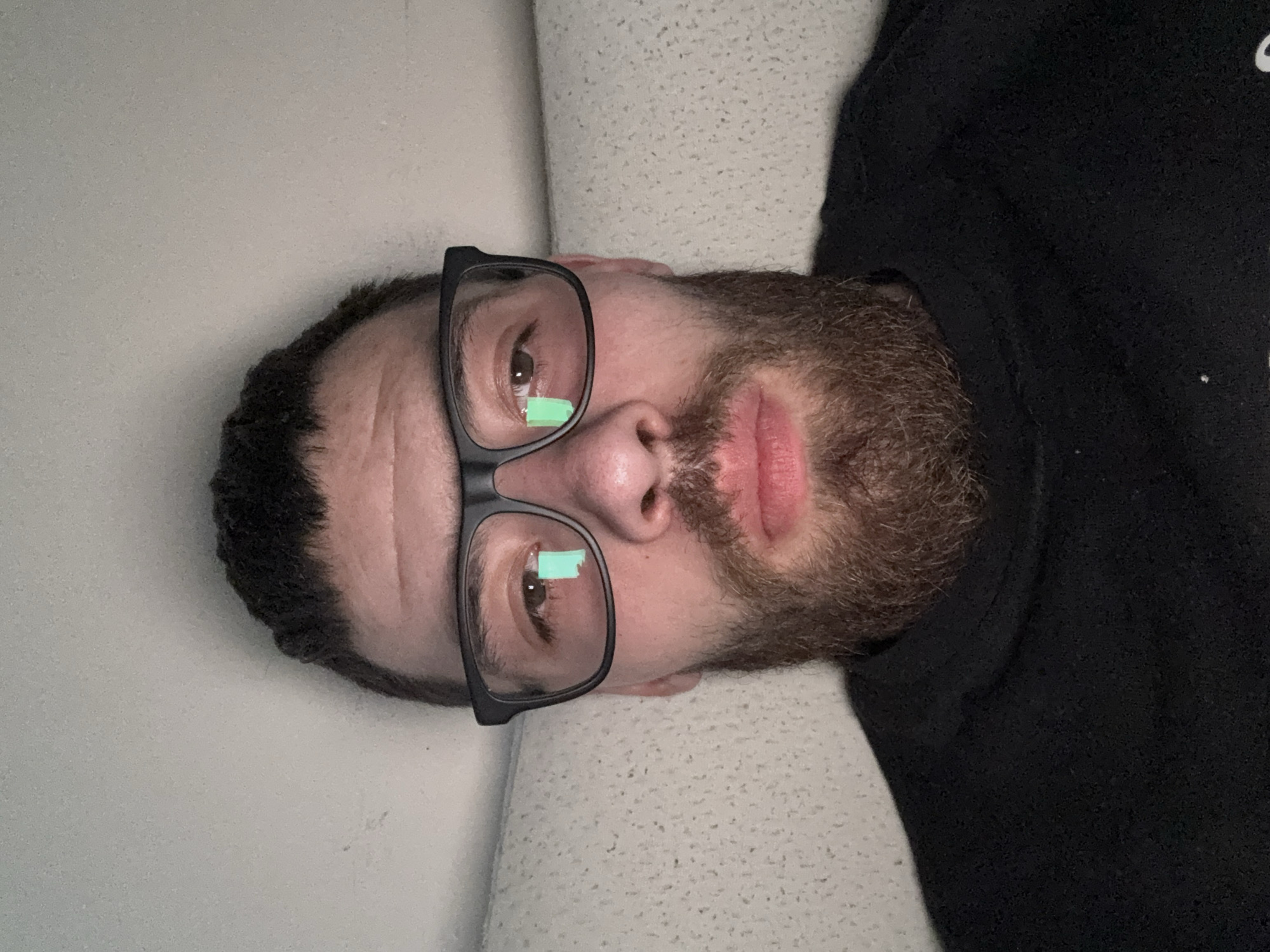 A man with dark hair and a beard, wearing black framed glasses and a black top, is lying on a light-colored, textured surface