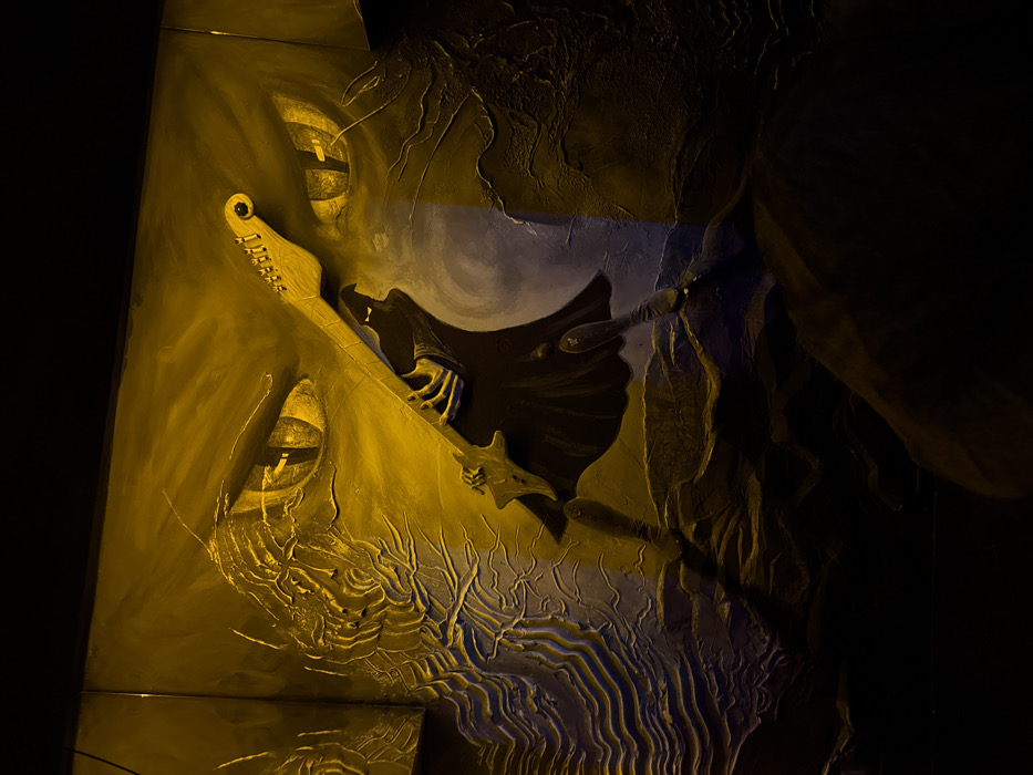 The image displays a detailed, illuminated, multi-panel artwork installed at RockIt Bar&Kitchen in Sofia, Bulgaria. The central subject is a three-dimensional relief of a dark, cloaked, hooded figure, resembling the Grim Reaper, actively engaged in playing a pale yellow electric guitar. The figure's skeletal hands are positioned on the guitar's neck and body, and its lower body, including boot-clad feet, is depicted in mid-stride over a dark, textured, uneven ground. In the upper background, two large, prominent, reptilian-style eyes with vertical pupils glow intensely with golden-yellow light, set against a dark, contoured background surface. To the immediate left of the central figure, a heavily textured, sculpted relief pattern, resembling organic forms or waves, is visible in contrasting shades of yellow and blue. Behind and to the right of the figure, a large, circular, pale object, consistent with a full moon, casts a softer ambient light. The entire scene is dramatically lit by strong, directional golden-yellow illumination, creating stark contrasts between highlighted textures and deep, dark shadows, enhancing the three-dimensional quality of the mixed-media artwork. The artwork combines painted elements with sculptural relief techniques.