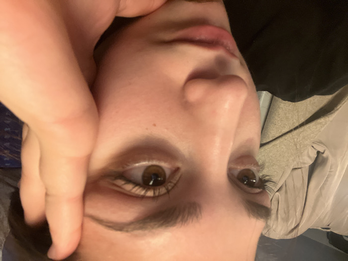 A close-up, slightly blurred image of a woman's face. The image is rotated counterclockwise. Her eyes are brown and wide open. A hand touches the left side of her face, obscuring some features. Her lips are visible at the top of the frame, and her nose is prominent. A gray-beige garment is visible on the right side of the image. The skin appears smooth and light-toned.