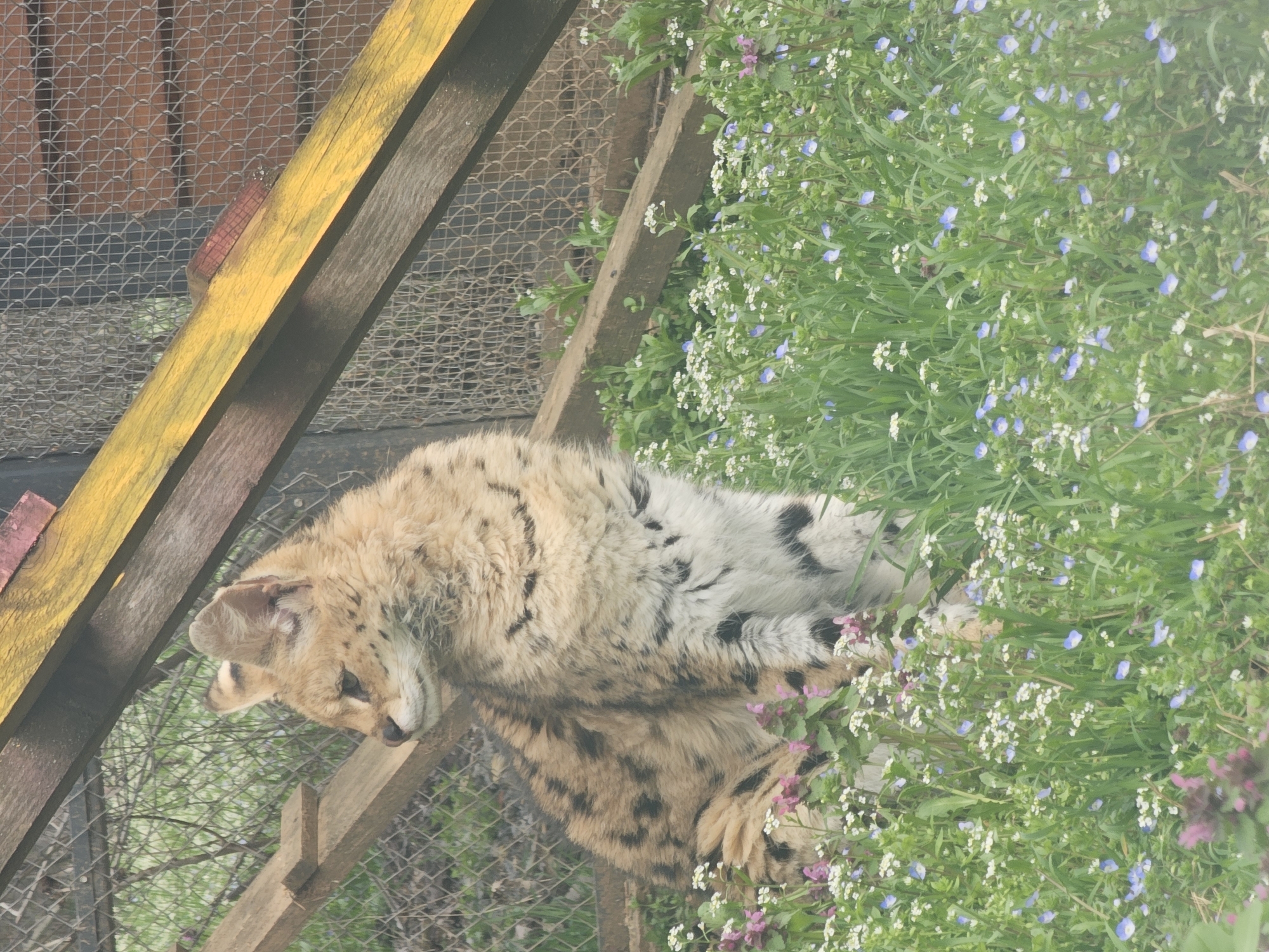 - "A serval cat is lying down on a wooden structure next to a patch of wildflowers in a fenced enclosure" by FM-L3FhD2, licensed under CC BY 4.0