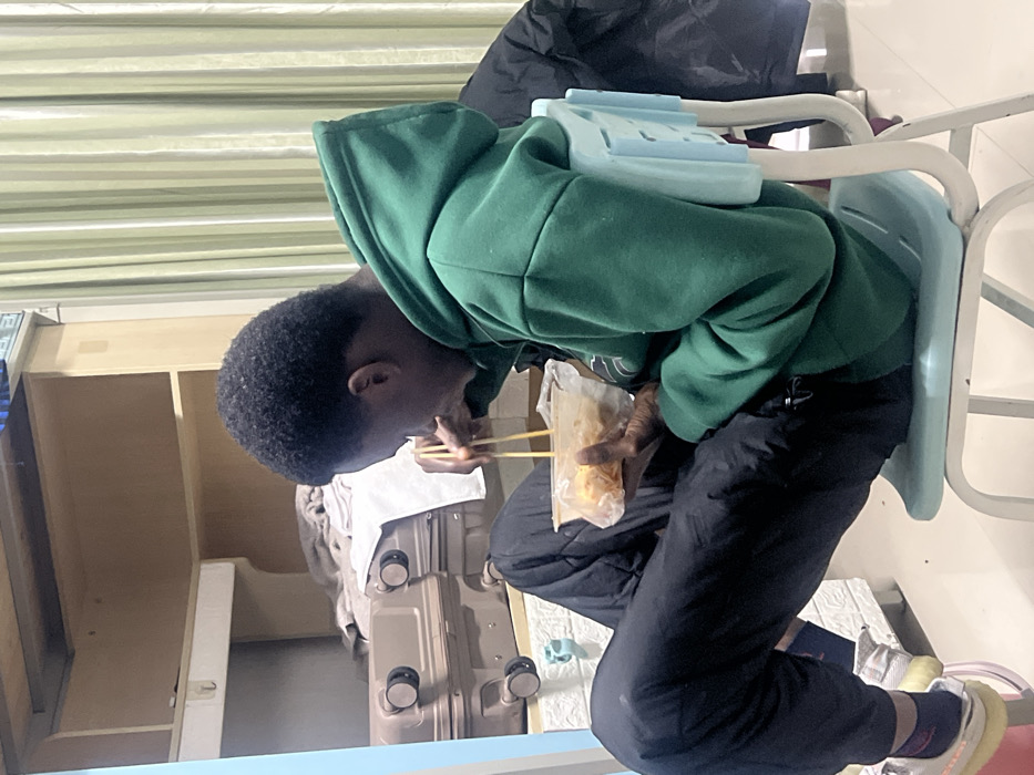 A person in a green hoodie sits on a light blue chair, eating with chopsticks from a clear plastic bag. They wear dark pants and sneakers. Behind them is a suitcase and an open cabinet. The background includes a striped wall, possibly a window covering. A black bag or jacket rests on the chair above them. The person is leaning forward, focusing on their meal.