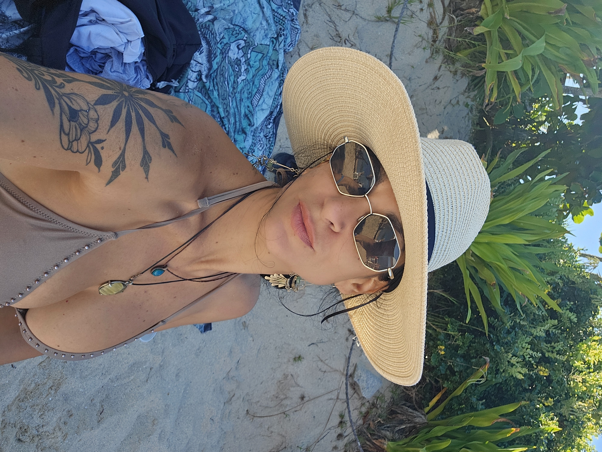 A woman in a bikini and a straw hat is lying on a beach in Armação Dos Búzios, Brazil. She has a tattoo on her left shoulder. She is wearing sunglasses and a necklace. Some clothes are near her. There are plants near her. The beach appears to be sandy.