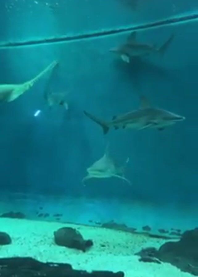 group of sharks and a sawfish swimming in a large aquarium. The aquarium has a sandy bottom with rocks and other debris. The water is clear and blue. The sharks are various sizes and species. They are swimming calmly and gracefully.