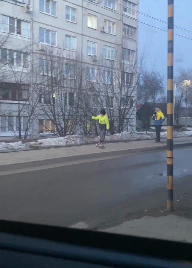 From the interior of a car, a man in a bright yellow jacket is seen roller skating on a sidewalk. Another person wearing a yellow and blue jacket walks on the same sidewalk in the opposite direction. A tall apartment building stands in the background behind bare trees. A black and yellow striped post is on the right side of the frame. There is snow on the edge of the sidewalk. The street is wet.