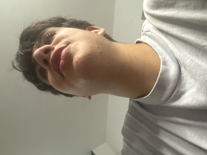 A low-angle shot looking up at a person. The individual has dark hair and skin. The camera focuses on the nose and lips, which are prominent. Part of a white t-shirt is visible in the upper right. The background is an out-of-focus white wall. The subject seems to be above the viewer.