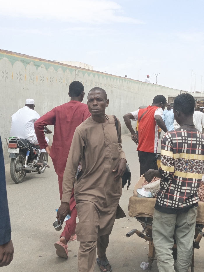 An outdoor scene in Fagge C, Nigeria, depicts multiple individuals on a paved surface alongside a decorative wall under a hazy sky