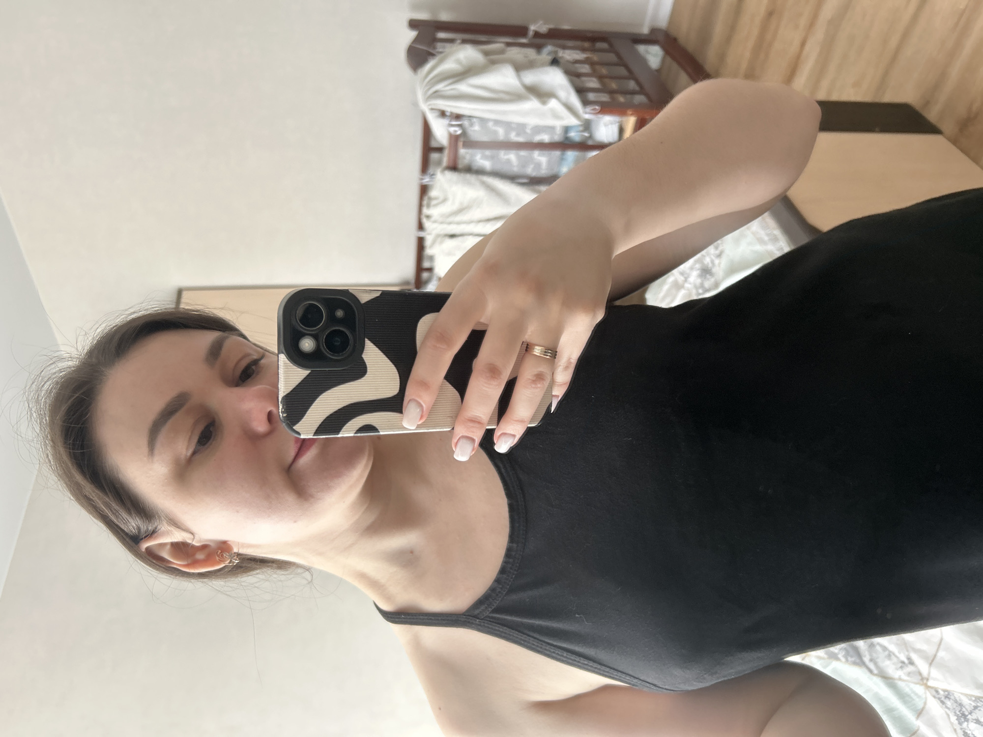 A woman is taking a selfie. She is holding a smartphone with a black and white patterned case. She has light skin, brown hair pulled back, and is wearing a black tank top. Her fingernails are painted light pink. She is wearing a gold ring on her ring finger and a small gold earring. The background shows a bedroom with a wooden crib and a bed with a patterned comforter. The image does not definitively indicate that the photo was taken in Chaikovsky, Russia.