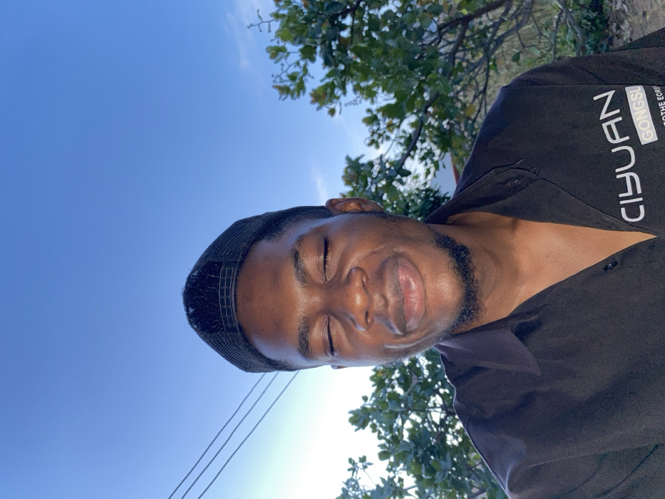 An outdoor image taken in Udu, Nigeria, depicts a dark-complexioned male subject from the chest up, positioned centrally. He is wearing a black collared shirt with white text, "CIYUAN GONGSU," visible on the right chest, and a black mesh trucker-style cap worn backward. His eyes are closed, and his lips are slightly pursed. Light stubble is present on his chin and jawline. The background consists of a clear blue sky occupying the upper half of the frame. Two horizontal power lines are visible in the upper left quadrant. Green foliage from trees and shrubs is present behind and to the sides of the individual, with a light-colored structure partially visible through the foliage on the far right. The scene is illuminated by natural daylight.