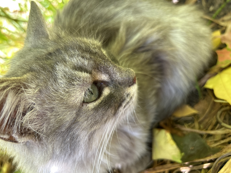 - "A close-up, high-angle portrait shot captures a long-haired domestic cat with grey and silver fur, featuring lighter white fur prominent on its chest and around its muzzle" by FM-kJsX23, licensed under CC BY 4.0