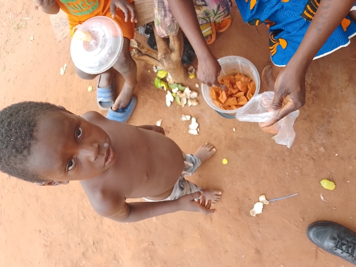 An outdoor scene in Ejule, Nigeria, is depicted on reddish-brown dirt ground. In the foreground, a young, shirtless Black male child, wearing patterned shorts and barefoot, looks directly at the camera; a white substance is visible around his mouth. To the right, an adult in a blue and yellow patterned garment is actively handling food. One of the adult's hands holds an empty clear plastic bag, while the other uses a utensil to scoop orange-colored, cooked food pieces from a white plastic bucket. Food scraps, including light-colored peelings and small green and yellow plant matter, are scattered on the ground near the bucket. In the background, the lower body of another child, wearing an orange t-shirt and blue sandals, is visible, with a clear plastic container holding a white substance and topped with a lid and straw on their lap. A black shoe is partially visible at the bottom right.