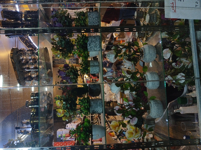 This image depicts a detailed view through a glass retail display case in a store located in Jaramana, Syria