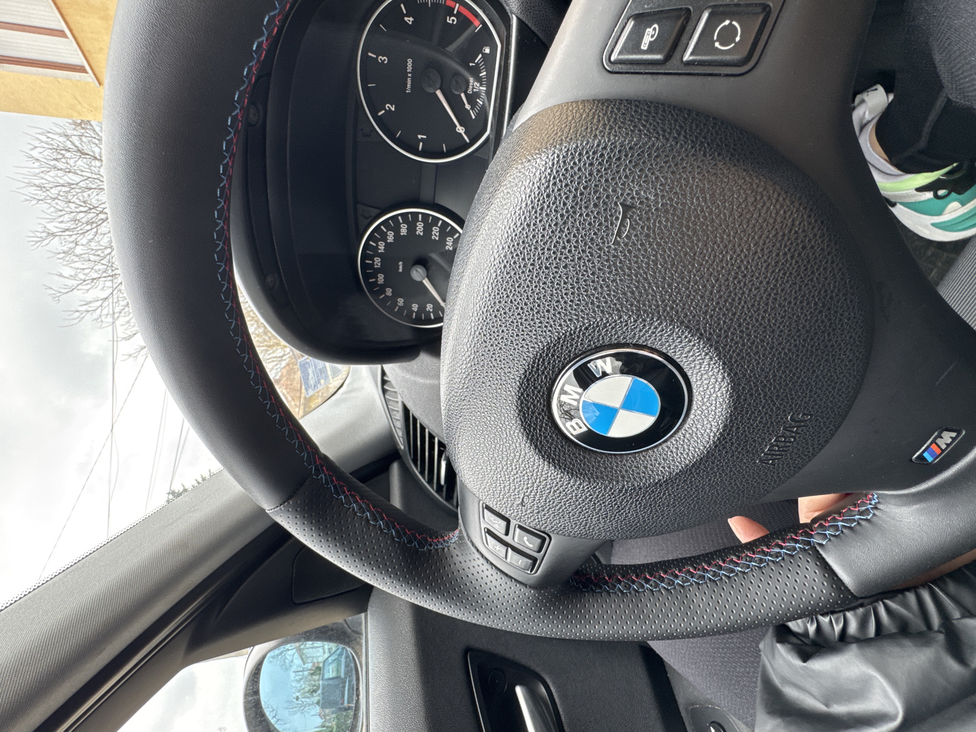 The image provides a detailed view from the driver's perspective inside a stationary BMW vehicle in Tankovo, Bulgaria. The central focus is the black leather-wrapped steering wheel, which features perforated sections and distinctive red and blue M-Sport stitching. A circular BMW emblem is centered on the steering wheel hub, above an "AIRBAG" inscription and a small "M" logo at the bottom. Control buttons for various functions are present on the left and right spokes. Behind the steering wheel, the instrument cluster is partially visible, displaying a speedometer calibrated to 240 km/h and a tachometer marked to 5 x 1000 rpm. A fuel gauge indicates approximately half a tank of diesel. The needles are at their lowest positions, indicating the vehicle's engine is off. A human hand, with a visible pink fingernail, is positioned on the lower-left section of the steering wheel. The driver's leg, wearing black pants and a multi-colored sneaker (white, teal, lime green, and black accents), is visible in the lower right corner. A black, possibly synthetic, garment rests over the driver's lap or leg. Through the windshield, an overcast sky with light grey clouds is visible. Bare tree branches are prominent against the sky, suggesting a colder season. A portion of a yellow building with white-framed windows is discernible in the upper-right background. Overhead power lines are also visible in the sky. The driver's side mirror, positioned on the left, reflects a blurred image of another vehicle, possibly a van, and additional environmental elements.