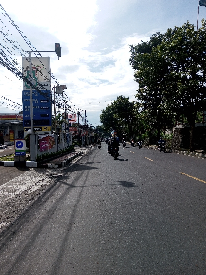 This image captures a daytime street scene in Domphoog_Dungkarchhoeling, Bhutan, under a sky exhibiting scattered white clouds. The central element is a wide, dark asphalt road extending into the distance, with a solid yellow line visible on its right side. On the left, a tall, prominent vertical sign for "PERTAMINA" displays fuel types including PERTAMAX TURBO, PERTAMAX, PERTAMINA DEX, and DEXTEL, each with associated prices. The text "CCTV" is also visible at the bottom of this sign. Adjacent to the sign, portions of a gas station structure, identifiable by red and yellow elements, are present. A small white and blue sign marked "ENTRY" with a right-pointing arrow indicates an access point. A complex network of black utility wires crisscrosses overhead, supported by poles. A concrete sidewalk with black and white striped curbs lines the road, with multiple promotional banners or posters attached to a low barrier. Numerous individuals are observed operating motorcycles on the road, traveling away from the camera. Most riders are wearing helmets. Shadows of utility poles and overhead wires are cast across the asphalt. The right side of the road features a continuous line of large trees with dense green foliage, providing a natural barrier. Behind these trees, a stone wall is partially visible. The overall environment suggests an active thoroughfare within an urban or semi-urban setting.