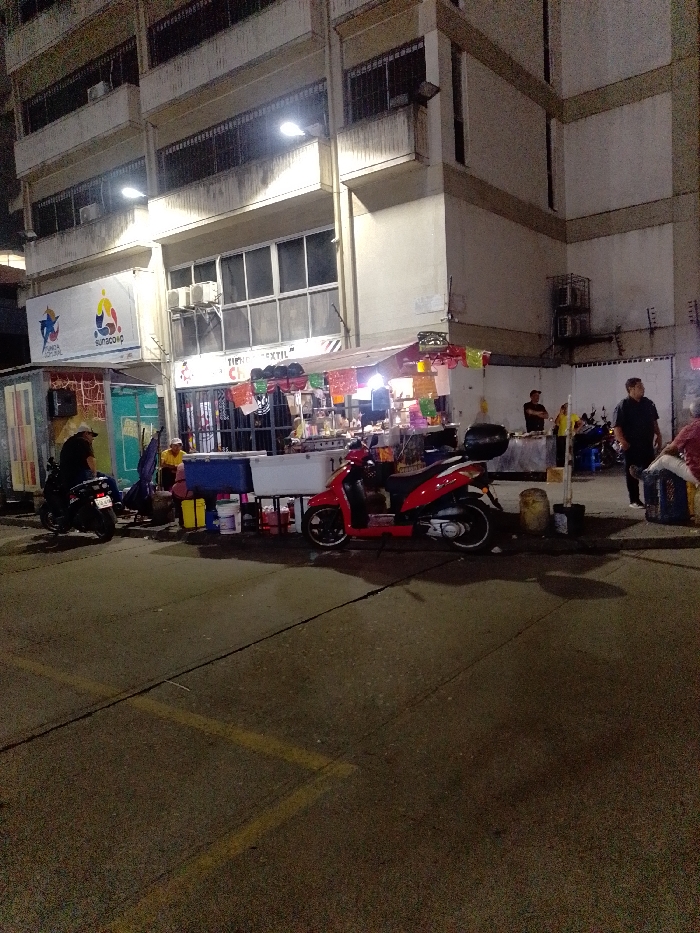 The image displays a nighttime urban scene in the city of Caracas, Venezuela. The foreground consists of an asphalt surface, possibly a street or parking area, with faint yellow ground markings. In the midground, an informal street market is operational in front of a multi-story concrete building. The building, which forms the background, features commercial establishments on its ground floor. A white banner with blue and orange logos and the partial text "SUNASCOP" is visible on the left side of the ground floor. Adjacent to it, another storefront displays the partial text "TIENDA TEXTIL" (Textile Shop). The building has multiple windows across its visible three floors, some equipped with security bars. Wall-mounted lights illuminate the building's facade, and external air conditioning units are present. At street level, directly in front of the building, several vendor stalls are set up. A central stall features a white countertop, overhead lighting, and is decorated with colorful papel picado (cut paper banners). Various buckets, containers (including yellow and blue ones), and other vendor supplies are positioned around the stalls on the ground. Approximately six individuals are present in the scene. One person is seated or crouched near a stall on the left. A person wearing a yellow shirt is visible near the central stall. Two men are standing behind the central stall towards the right, and another man in a dark shirt is standing or walking further right. Two primary vehicles are visible: a red scooter with a black rear storage box is parked in front of the central stall, facing right. To its left, a dark-colored motorcycle is parked, facing away from the viewer. Additional motorcycles are partially visible in the background on the right side. The scene depicts active nocturnal commerce within an urban setting.