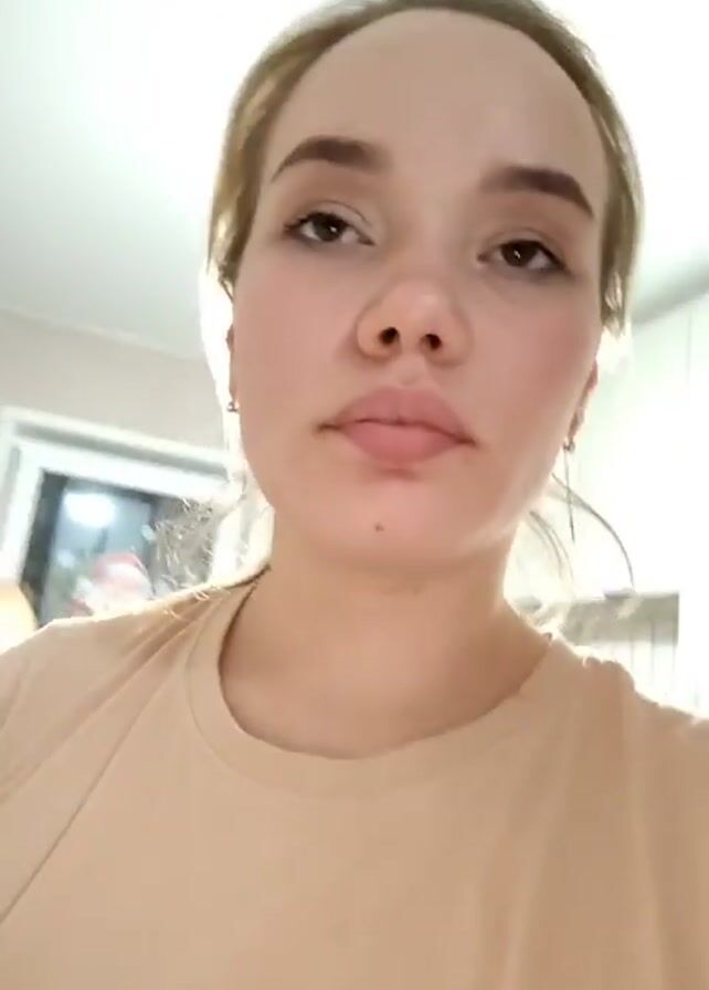 A young woman is seen from the chest up. She is wearing a beige t-shirt and has her blonde hair pulled back into a low ponytail. She is indoors, and the camera appears to be hand-held. The woman looks directly at the camera initially, then her gaze shifts up and around the room. The background includes a white wall, a window with a Santa Claus figure visible in it, and a light fixture on the ceiling. The woman appears to be chewing something and her lips move slightly. The lighting in the room is bright.