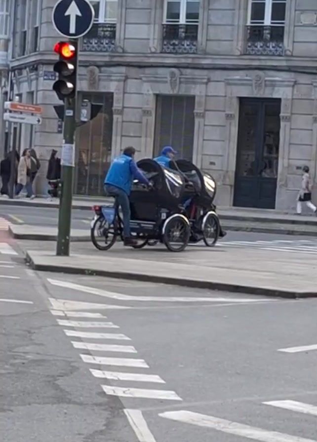 two men on a bicycle-like carriage waiting at a red light on a city street. Both men are wearing blue vests, and one has a blue hat. The carriage they are on has a black passenger compartment. Behind them, pedestrians cross the street. The building on the corner has an "Allianz Seguros" sign. The traffic light has a red light and a sign indicating traffic is allowed to go straight. The street is marked with a pedestrian crossing. Other cyclists pass by in the background.