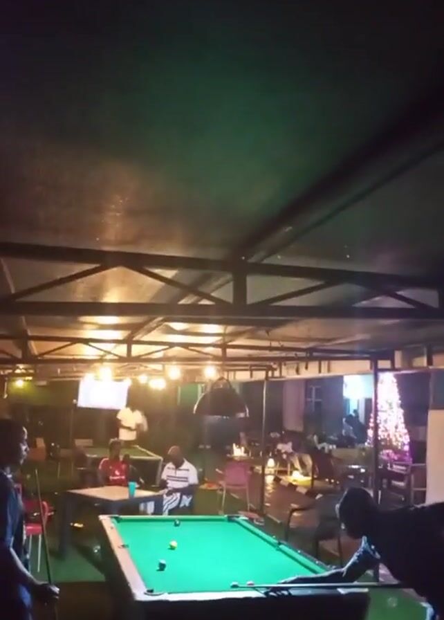 n open-air bar at night with several patrons. In the center of the frame is a pool table with two men playing pool. One man is holding a pool cue and is positioned to take a shot, while the other stands nearby. Several other patrons are seated at tables in the background, some watching television. There are hanging lights and a Christmas tree in the background. The bar has a roof made of metal beams and a fabric covering.