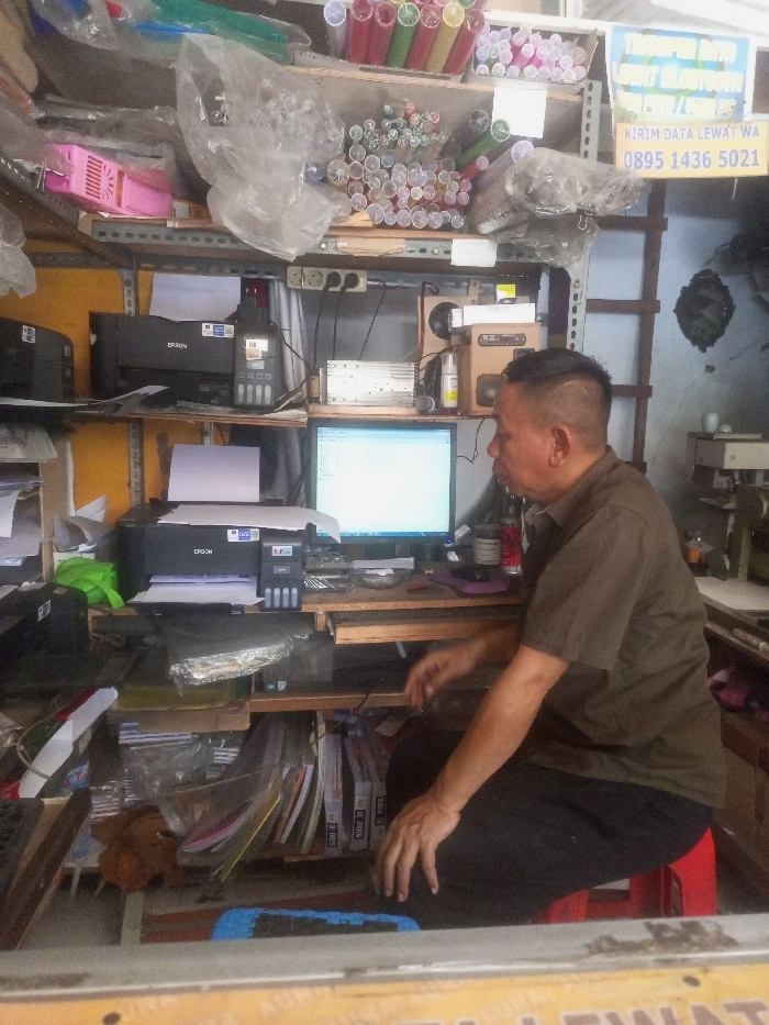 A man is sitting on a red stool in front of a computer. He is wearing a brown shirt and black pants. He is looking at the computer screen. The computer is on a desk with a printer, several stacks of papers, and other miscellaneous items. The room is small and cluttered. There are several shelves with various items on them. Above the shelves are a few signs. There are a variety of objects and papers on the shelves. The walls are painted yellow. The man's right hand is resting on his lap and his left hand is on the desk. The photo was taken in an unknown location. The coordinates (latitude: 666, longitude: 666) are invalid. The man's eyes are focused on the computer screen. The photo is taken from a low angle, looking up at the man. The photo is in focus and well-lit.