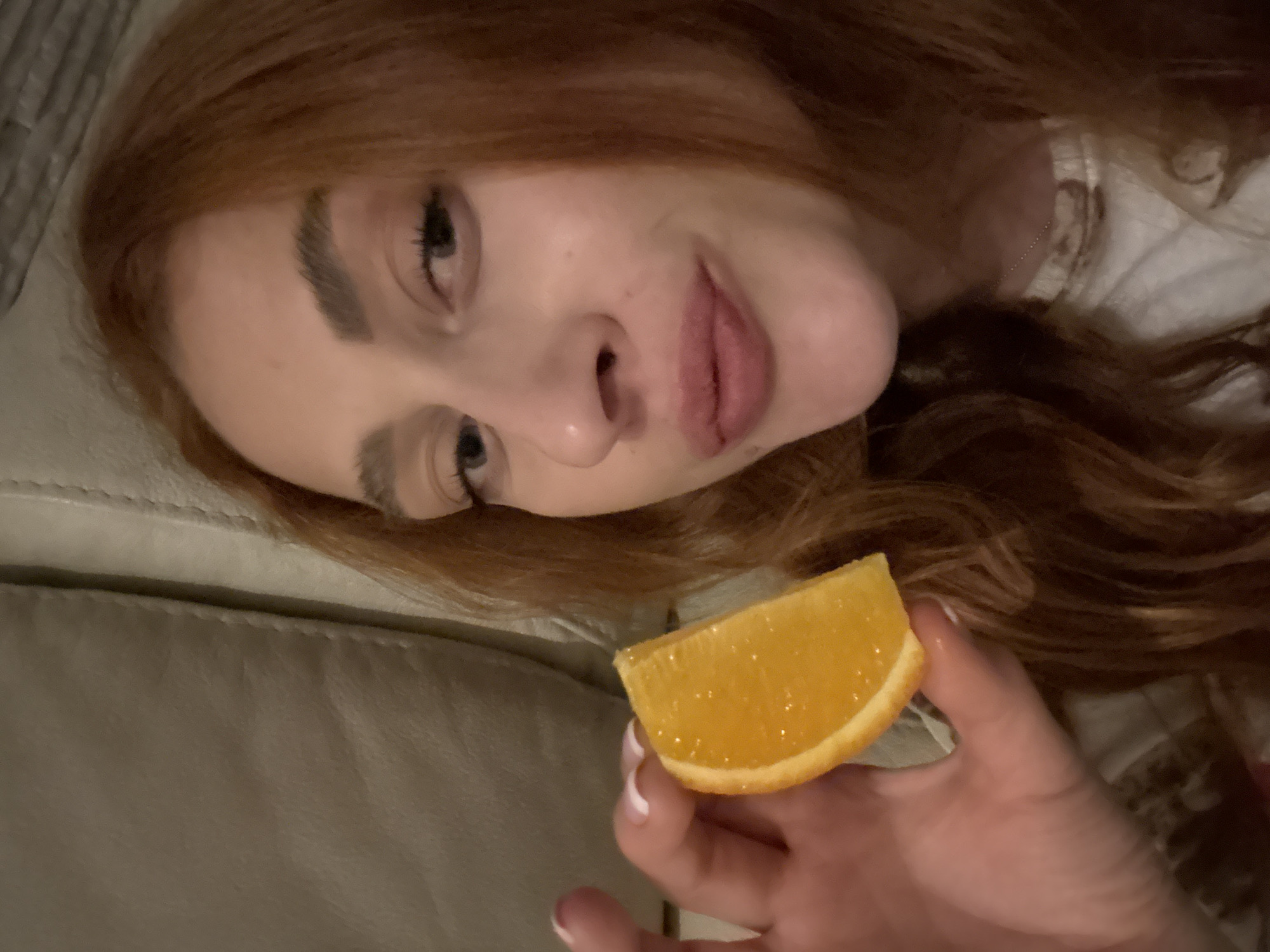 A woman with reddish-brown hair and fair skin is lying down, possibly on a light-colored leather or faux-leather couch. She is holding a slice of orange in her hand, close to her face. The orange slice has visible segments and appears juicy. She has her face angled towards the camera with a slightly playful expression. The environment seems to be indoors and casually lit. There is no immediately discernible information to determine that the location is in Budva, Montenegro.