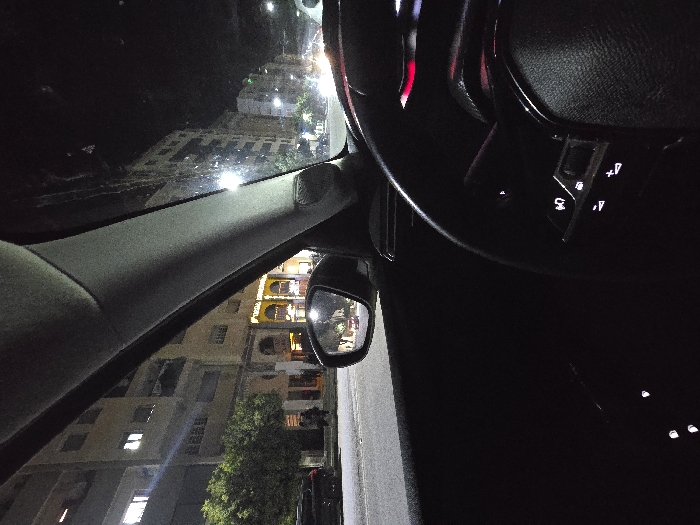 - "Inside a car at night, the steering wheel dominates the right side of the frame with its illuminated controls" by FM-E6cAs1, licensed under CC BY 4.0