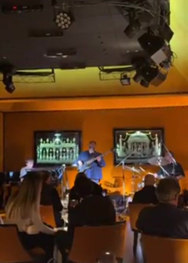 live band performing for an audience in a dimly lit restaurant. The band consists of four musicians: a keyboard player, a bassist, a drummer, and another musician who is obscured by the others. The bassist is in the center of the frame, playing his instrument while standing. The audience is seated at tables, enjoying the music. The restaurant has orange-colored walls with framed artwork. The ceiling is dark and features an array of lighting equipment. The camera is static throughout the video.