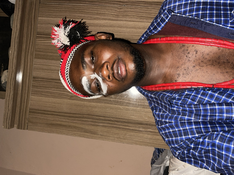 The image presents a close-up, chest-up portrait of an adult male in an indoor setting within Muchiya, Nigeria