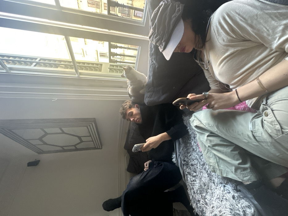 The image displays an indoor scene featuring three individuals and a cat within a room, likely a living area, illuminated by natural light from a large window