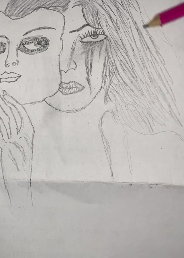 partially completed pencil sketch of a woman. On the left, she is depicted holding a mask up to her face. The mask is blank and expressionless. On the right, the woman's face is visible, and she appears to be crying with dark streaks running down her cheek. The drawing has fine lines and shading. A pink pencil hovers near the right side of the drawing, as if in the process of being used. The sketch is on a piece of white paper, and there are other pieces of paper visible beneath.