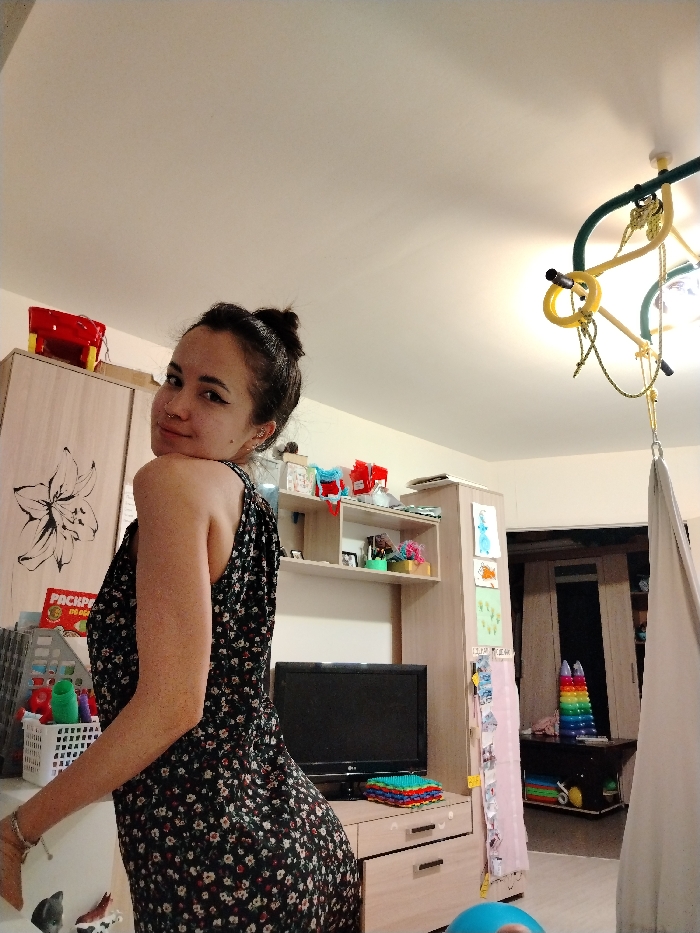 The image displays an interior residential room located in the city of Noviy, Russia. A young adult female subject is centrally positioned, angled slightly away from the camera but with her head turned to face the viewer directly. She has dark hair styled in a bun, visible eyeliner, and a small nose ring on her left nostril, displaying a slight smile. She is wearing a dark, sleeveless dress patterned with small white and red flowers. The background reveals a furnished room. To the left of the subject, a light-colored wooden wardrobe is visible, adorned with a large black and white floral decal. A red rectangular container rests on top of this wardrobe. Below it, a white plastic basket filled with various colorful objects is present on a shelf. Behind the subject, a light-colored wooden shelving unit and desk combination is visible. A black LG flat-screen television is placed on the desk, with a stack of colorful, folded items beside it. The shelves above the television hold various small objects, including crafts, framed items, and containers. To the right, an indoor play structure made of yellow and green metal tubing is suspended from the ceiling, featuring rings and ropes. A light-colored fabric swing or hammock hangs from this structure. Further right, an open doorway leads to an adjacent, darker room. Several children's drawings are taped to a vertical surface near this doorway. In the background room, a colorful stacking ring toy is visible on a dark surface. A blue ball is partially visible in the bottom right corner of the frame. The room has light-colored walls and ceiling, illuminated by an overhead artificial light source.