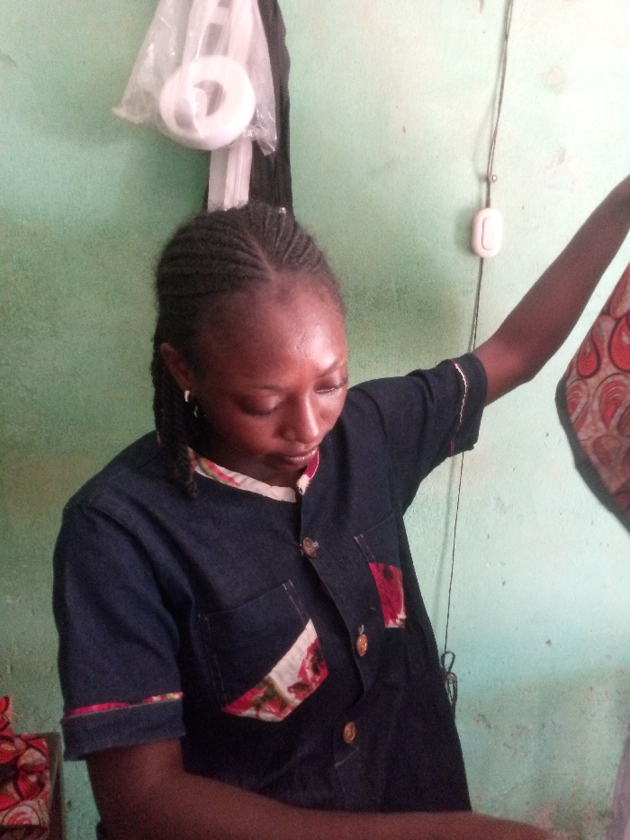 An adult female subject is situated indoors in Maigizo, Nigeria. She has dark skin and braided hair, wearing a short-sleeved dark blue shirt featuring patterned fabric accents on the collar, two breast pockets, and sleeve cuffs, fastened with gold-toned buttons. Small silver hoop earrings are visible. Her head is angled downwards, directing her gaze out of frame. Her right arm is raised, holding a section of patterned fabric with red and white elements. The background is a light green wall. A transparent plastic bag containing a white roll is suspended on the upper left wall. A white electrical switch or outlet is affixed to the mid-right wall, with a dark wire descending from it. A dark, thin cord or string also hangs near the switch. Portions of patterned fabric are visible on a surface at the lower left of the frame.