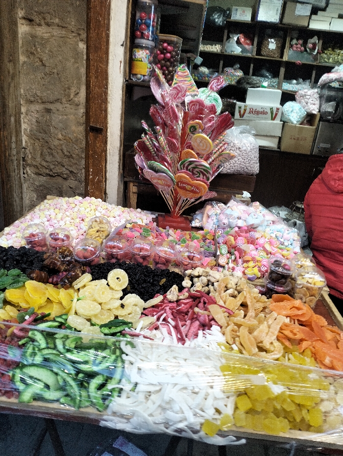 The scene depicts a vibrant market stall in Damascus, Syria, laden with confections and dried produce. A wooden counter in the foreground is covered with an extensive display. On the left, a large mound of small, pastel-colored marshmallows is present. Towards the center, numerous piles of dried fruits are arranged, including dark raisins, light-colored dried berries, shredded red and white fruits, and yellow pineapple rings. Further forward, organized rows of dried fruits, partially covered in clear plastic film, feature green slices, shredded white coconut, yellow fruit cubes, and orange slices. A red stand centrally displays a dense arrangement of colorful lollipops, many spiral-patterned or heart-shaped with "Love You" text. Adjacent to this, various loose colorful candies and small clear containers of sweets are visible. The background reveals a rough stone wall and a wooden vertical beam on the left. On the right, shelves hold packaged goods, jars of candies and nuts, and white boxes, one labeled "Regalo." The upper back and shoulder of a person in a red jacket are partially visible on the far right, standing adjacent to the stall.
