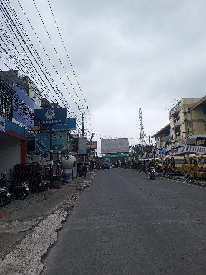 A straight road under an overcast sky is lined with various buildings and shops on either side. Utility poles and wires crisscross overhead. Motorbikes are parked on the left sidewalk, while yellow vans are parked on the right. A few people are visible along the sidewalk, and a scooter travels down the road. Several signs and advertisements are attached to the buildings, and a tall communication tower stands in the distance.