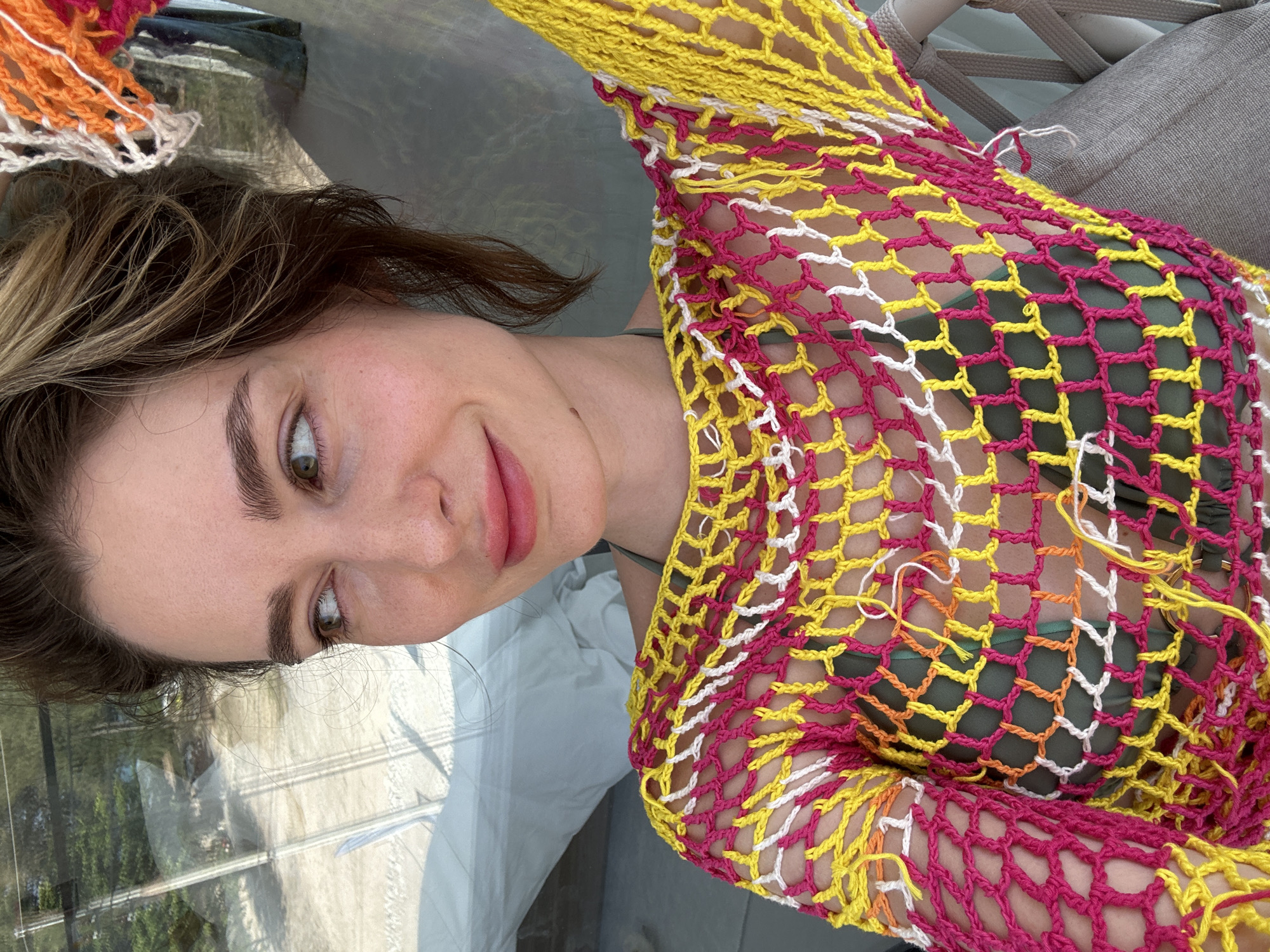 A woman with fair skin and short brown hair, wearing a yellow, pink, and white mesh top over a green bikini top, smiles toward the camera