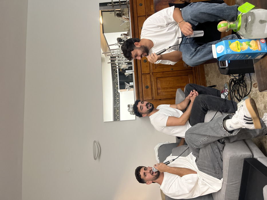 This image depicts an indoor scene within a residence in Ramat Gan, Israel. Three adult males are seated in a casual living area. The man on the left is positioned on a grey sofa, wearing a white t-shirt and grey pants, holding a wired microphone to his mouth. The man in the center is also on the grey sofa, wearing a white t-shirt and dark pants, looking towards the right. The man on the right is seated on an adjacent piece of furniture, wearing a white t-shirt and blue jeans, holding a wired microphone and smiling while observing the center man. Black audio cables are visible on the floor, connecting to a small black portable speaker unit. On a wooden table in the foreground, a carton of Prigat brand lemonade and a clear glass bottle, consistent with a spirit bottle, with a green ribbon and cork stopper are present. The background features a plain white wall with a circular ceiling light. A long, horizontal mirror is mounted on the wall, reflecting decorative items including crystal candlesticks and martini glasses. Below the mirror, a dark wooden credenza with cabinets and drawers is visible. The floor throughout the visible area is wood.