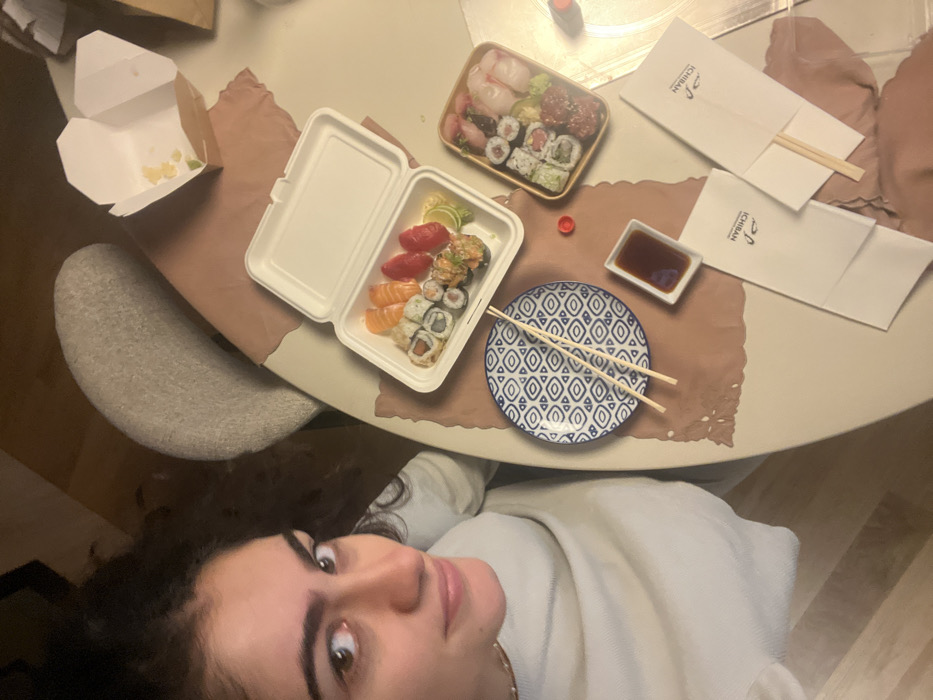 A woman smiles at the camera in a selfie. A round table is covered with a brown scalloped placemat. Sushi takeout containers, one open, and a sauce dish sit on the table. Chopsticks rest on a blue and white patterned plate. Branded chopstick sleeves are placed near the containers. A mostly empty takeout container and a gray chair are visible. The setting appears to be indoors, possibly a dining area.
