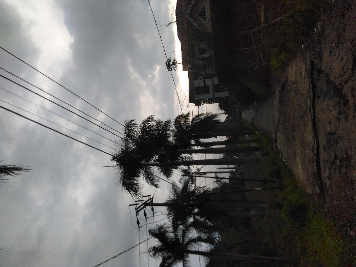 The image displays an unpaved, uneven dirt path extending into the background under a heavily overcast, dark grey sky. A faint area of lighter sky is discernible in the upper right. Multiple parallel power lines traverse the upper portion of the frame diagonally, originating from a utility pole equipped with several cross arms and insulators, positioned on the left side of the path. A prominent row of tall palm trees, silhouetted against the sky, lines the left edge of the path. Patches of green grass and weeds are visible in the immediate foreground on the left. The right side of the path is bordered by dense, dark vegetation. In the background, on the right, two structures are visible: a multi-story building with dark facades and an adjacent building featuring a reddish-brown tiled roof with a gable. No individuals, vehicles, or animals are present within the scene. The scene is observed in the city of Unknown, Norway.