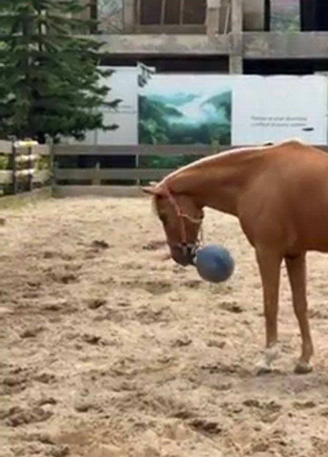 A horse stands in a sandy pen with a gray ball hanging in front of its head
