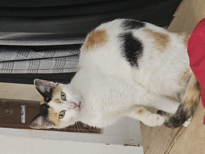 - "A calico cat with predominantly white fur, accentuated by patches of black and tawny brown, sits upright on a light beige, textured surface" by FM-HWmcZ2, licensed under CC BY 4.0