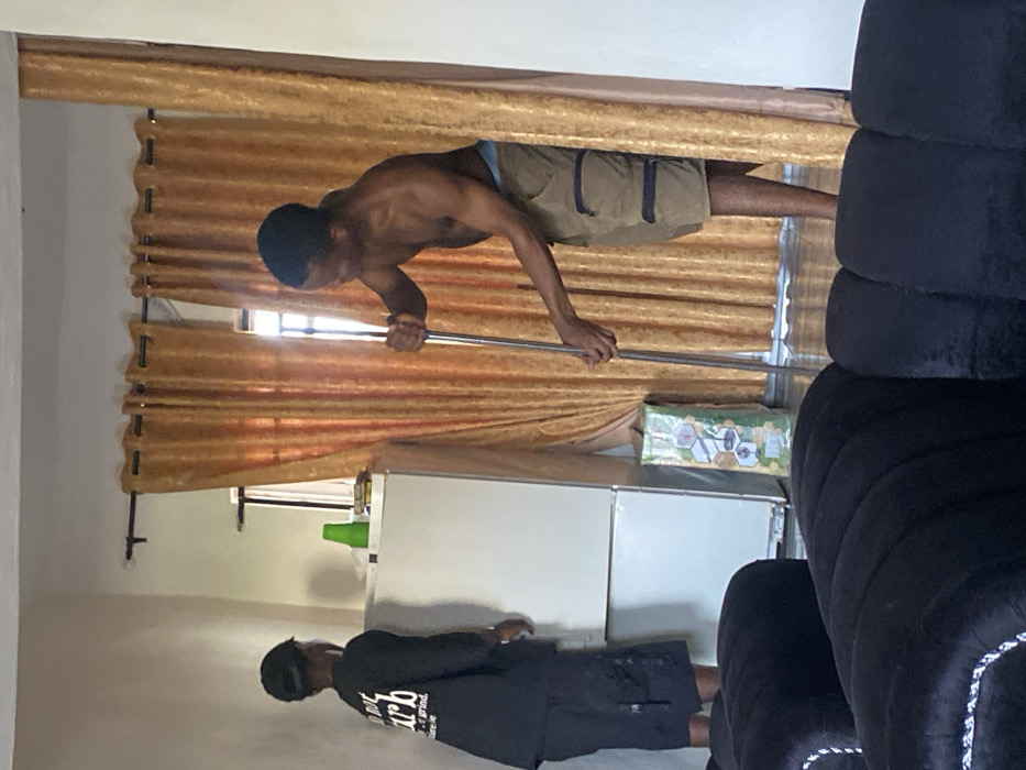 The image depicts an indoor scene in the city of Onitsha, Nigeria, featuring two adult males and various household objects. In the left background, a male wearing a black long-sleeved shirt with white text, black cargo shorts, and a dark baseball cap stands with his back largely to the viewer, facing a white two-door refrigerator unit. His left hand is positioned near the refrigerator. A green plastic cup and other small, indistinct items are visible on top of the refrigerator. To the right, a shirtless male, wearing light-colored cargo shorts and a visible light blue waistband, holds a long, silver metallic pole vertically with both hands. He is oriented towards the right but his gaze is directed towards the left. In the mid-ground, behind the individuals, golden-brown grommet-top curtains hang on a dark rod, covering what appears to be a window or doorway, with bright light emanating from behind them. A green and white patterned bag or package, featuring hexagonal designs, is on the floor between the refrigerator and the curtains. The floor appears to be a light-colored surface. In the immediate foreground, partially visible and out of focus, are segments of two dark, upholstered sofas with ribbed designs and white piping along their edges. Both individuals appear to be engaged in separate tasks within the room.
