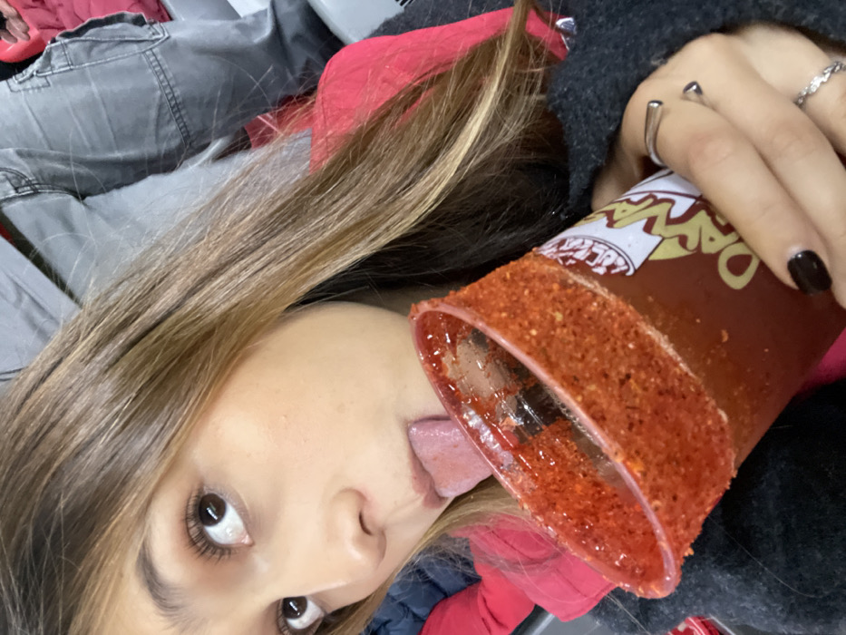 A young female is depicted in a close-up selfie within a stadium environment. She has light brown hair, dark eyes, and is extending her tongue towards the heavily chili-rimmed edge of a transparent plastic cup containing a dark beverage. Her right hand, with dark-painted fingernails and two silver-colored rings (one an open-design on the index finger, one a patterned band on the ring finger), holds the cup. The cup features a white and yellow logo with partial text "DAYVAS" visible. She wears a dark grey or black outer garment over a red layer. In the blurred background, red stadium seating is visible, along with the lower torso and legs of an individual wearing grey cargo pants, and a person in a blue and red jacket. The red seating and stadium context strongly suggest the location is the Estadio Nemesio Díez in Toluca, Mexico, home of Deportivo Toluca Fútbol Club, known for its red team colors.
