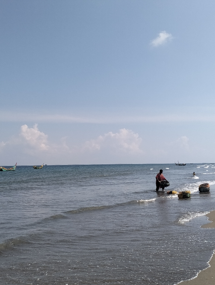 - "A calm seascape features a man wading in shallow water, likely a fisherman tending to his catch in circular baskets along the shoreline" by FM-sAcf03, licensed under CC BY 4.0