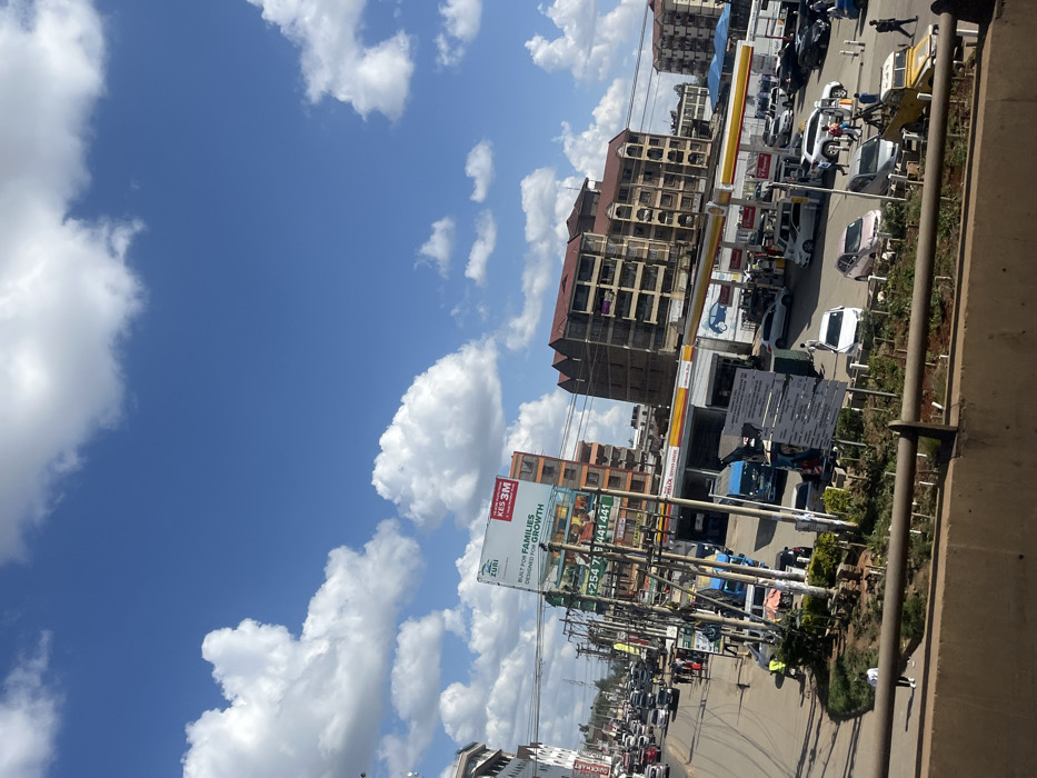 The image depicts a busy urban street scene in Kahawa Sukari ward, Kenya, viewed from an elevated vantage point