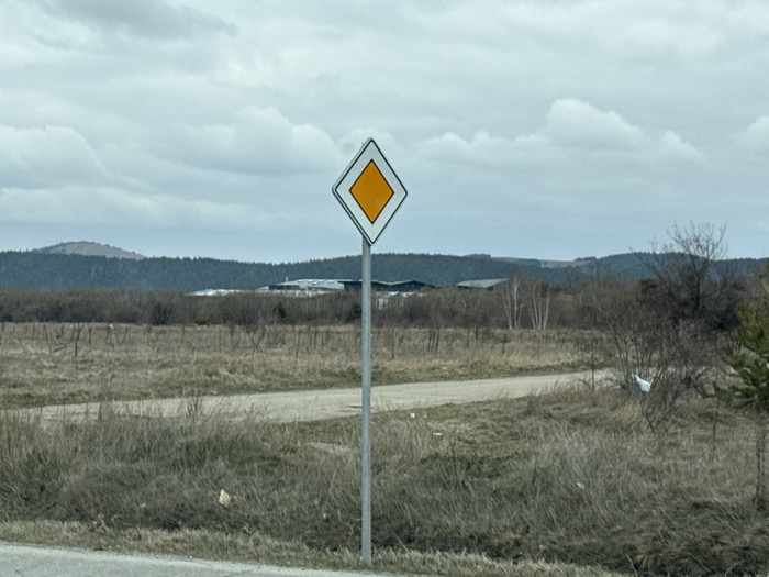 The image presents a wide view of a rural or semi-rural landscape located in Dospey, Bulgaria, under an overcast sky. A diamond-shaped traffic sign, indicating a "priority road" (white border with a yellow inner square), stands prominently on a grey pole in the right-center foreground. The immediate foreground shows a portion of a paved road surface at the bottom edge, transitioning into an area of dry, dormant brown and green grasses and weeds. A dirt track branches off to the left, curving into the field. Scattered litter, including a white plastic bag and a yellow wrapper, is visible among the dry vegetation near the base of the sign and along the dirt track. In the midground, the field continues with similar dry vegetation, interspersed with small, bare deciduous trees, including a cluster of thin, white-barked birch trees towards the right. Further back, several low-rise buildings with dark roofs, suggestive of agricultural or industrial structures, are situated amidst light foliage. The background features a dense, dark green coniferous forest covering undulating hills. A distinct, rounded hilltop, appearing less densely forested or partially bare, is visible above the tree line on the left side. The sky is uniformly covered with grey and white clouds, suggesting an overcast day. No human or animal figures are present in the scene.