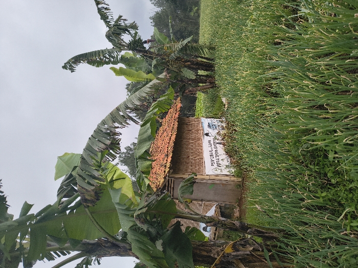 A tilted view shows a small, rustic structure with a terracotta tiled roof, nestled amidst lush greenery. Banana trees with broad leaves frame the building, while a dense field of green plants, likely a crop, extends to the right. A sign is affixed to the building's side. Overcast sky suggests a cloudy day. The overall setting evokes a rural or agricultural scene.