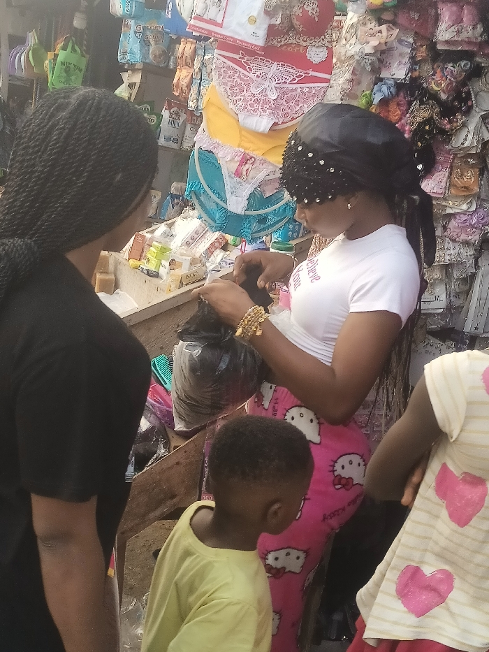 A woman in a white t-shirt and pink Hello Kitty pants stands at a market stall, handling a black plastic bag. She wears a black head covering with decorative stones and multiple gold bracelets. Another woman in black stands to her left, looking towards the stall. A young boy in a yellow shirt and another child in a striped shirt with pink hearts are in the foreground. Underwear and various goods are displayed on shelves behind the stall.