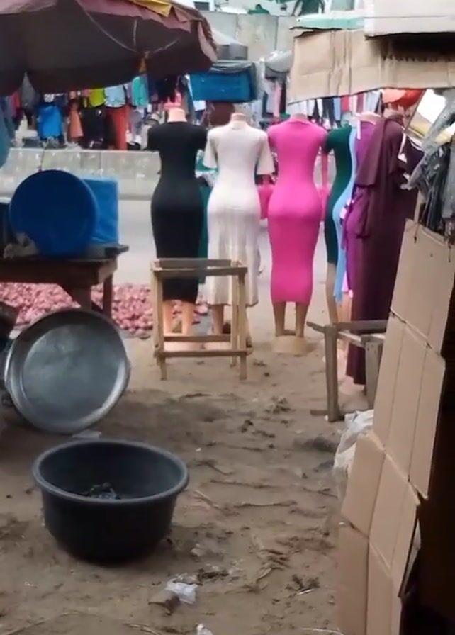 roadside market scene in an urban area. A clothing display with several mannequins wearing colorful dresses stands in the foreground near some cardboard boxes. The ground is dirt and debris. Behind the mannequins, there are other clothing items on display and some people milling about. To the left of the mannequins, a table holds blue containers, a large metal dish, and what appears to be a collection of red onions. Next to the table, there is a black plastic basin. The camera pans to the left to reveal more of the market area, including a woman in a turquoise robe and hijab pushing a cart past a white and blue van with its hood up and a man working on the engine. Heaps of red onions are scattered on the ground. Overhead are umbrellas providing shade.
