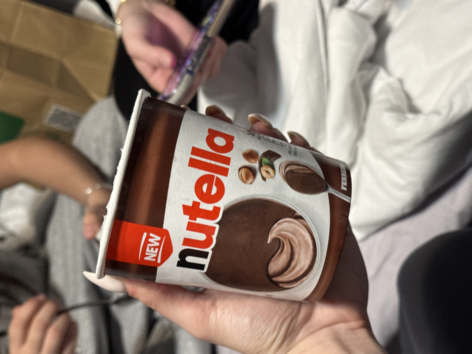 The scene is located indoors in Tarnów, Poland. In the foreground, a fair-skinned hand with light-colored, elongated fingernails holds a large, cylindrical Nutella container. The container is predominantly white and brown, featuring the "nutella" logo in red and black, a red "NEW" label, and illustrations of hazelnuts, chocolate, and a spoonful of Nutella. To the left and rear of the Nutella container, the arm and torso of an individual are visible, wearing gray clothing and a silver bracelet on their left wrist. Their hand holds a thin, dark utensil, possibly a spoon. To the right and further back, a third individual's hand is visible, holding a smartphone with a reflective, possibly iridescent, case. A gold-colored bracelet or watch is present on this individual's wrist. The background consists of soft, rumpled white and light gray fabric, indicative of blankets or bedding. A crumpled brown paper bag is partially visible behind the individual on the right. The overall environment appears to be a casual, relaxed indoor setting.