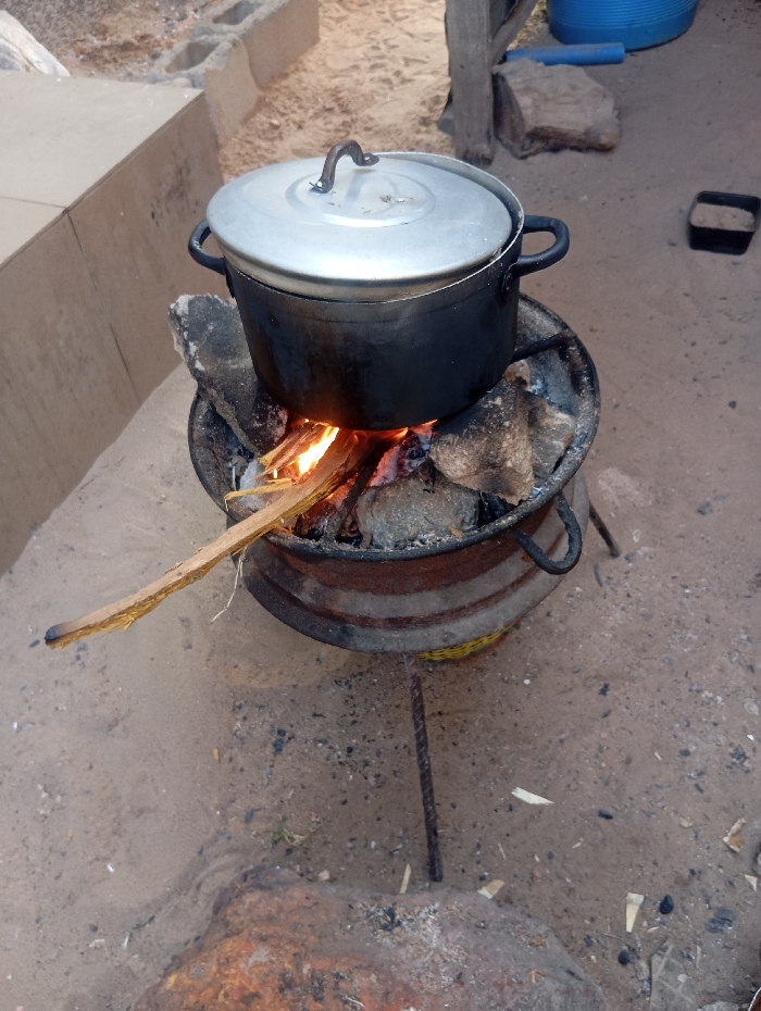 The image displays an outdoor cooking scene in the city of Unknown, Unknown. A black metal cooking pot, topped with a silver-colored lid, rests on three stones positioned over an active open fire. The fire burns within a makeshift stove constructed from a rusted, cut-down metal barrel or drum, supported by metal rebar legs embedded in the ground. A long, thin piece of light-colored wood extends from the sandy ground into the burning embers, contributing fuel. The ground is composed of sand and scattered ash, with small wood splinters visible. In the background to the left, a light-colored concrete structure or wall is present, with partially visible concrete blocks beyond it. To the right, a blue plastic basin or bucket, a dark wooden post, a large natural rock, and a small black rectangular container are visible on the sandy ground. No individuals are present in the frame.