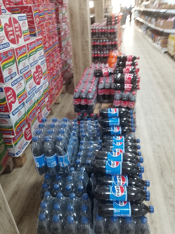 The scene depicts an interior view of a commercial establishment, likely a supermarket or wholesale store, located in the city of Agani, Nigeria. The flooring is light-colored, possibly concrete or tiled. On the left side of the frame, large quantities of red and white cardboard boxes are stacked on wooden pallets. These boxes are predominantly labeled "Indomie Instant Noodles Super Pack" and feature a heart graphic with the text "Show Some Love." The stacks extend vertically and horizontally, creating a wall of product. In the center and extending to the right foreground, numerous plastic bottles of beverages are organized in multi-packs. Dark-liquid sodas are prominent, including multiple stacks of Pepsi bottles with their distinctive blue labels, and Coca-Cola bottles with red labels. An individual orange-colored soda bottle is visible on top of one of the Coca-Cola stacks. Additional dark-liquid beverages in clear plastic bottles with blue caps are also stacked. The right side of the image features a retail aisle with blurred shelving units extending into the background, stocked with various consumer goods. Two indistinct human figures are visible in the far background of this aisle, appearing to be standing or moving. The lighting suggests an indoor, artificially lit environment.