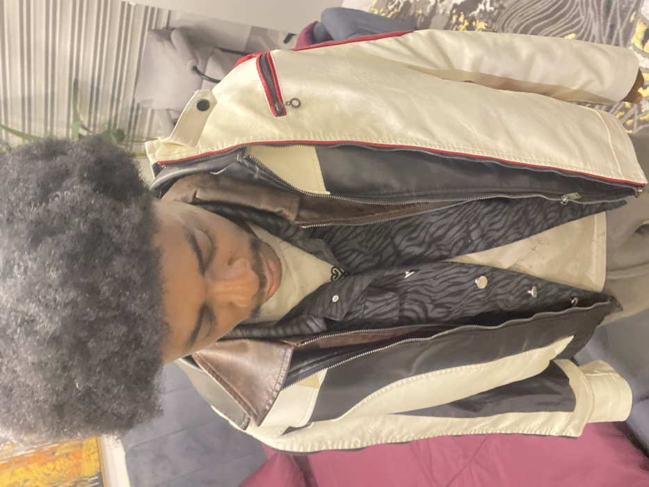 The image captures a male individual within an indoor residential setting in Igboefon, Nigeria. The individual, displaying dark skin and short, dense, dark curly hair, is seen from the chest up, with his head tilted downwards, eyes directed towards the lower frame. He wears a layered ensemble consisting of an outermost jacket featuring cream/off-white and black color blocks, a brown leather collar, silver-toned zippers, and distinct red piping along the main zipper and a zippered chest pocket on the right, which also has a small ring attached. Beneath this, a black button-down shirt with a grey/white zebra-like pattern is visible, adorned with a small heart-shaped buckle or design near the collar. An underlying light-colored (possibly beige) shirt and light grey trousers are partially visible. The background reveals a burgundy-colored upholstered surface (likely a bed or sofa) to the left, a dark sofa or headboard, and an abstract painting with orange and dark hues. To the right, a grey upholstered armchair is visible, along with green foliage from a plant and a wall featuring vertical stripes. The floor is covered by a multi-toned patterned rug. The scene is static, depicting a solitary figure in a contemplative or posed stance.